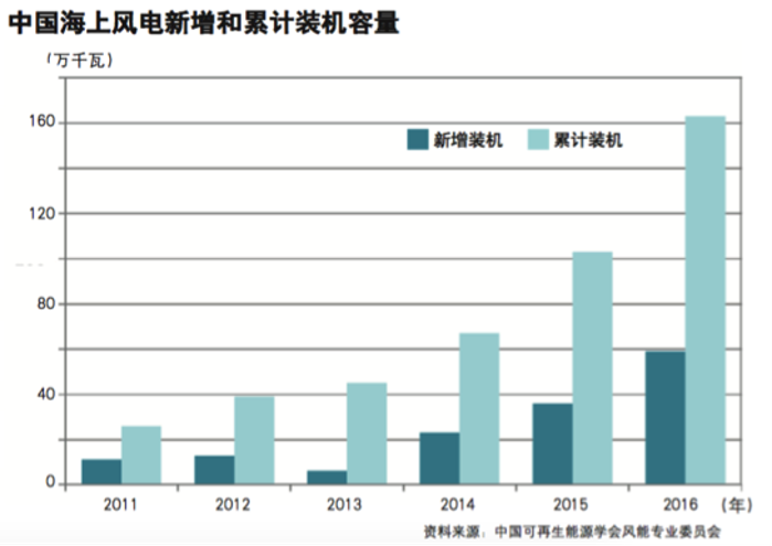 自2010年首個海上風電并網(wǎng)項目上海東海大橋海上風電場建成投產(chǎn)以來,在此后的3年里,江蘇如東3萬千瓦和15萬千瓦潮間帶試驗、示范風電場及其擴建工程陸續(xù)建成。2012年底,我國海上風電累計裝機接近40萬千瓦;受各種因素影響,2013年海上風電發(fā)展顯著減緩;自2014年以來,我國海上風電裝機迅速增加,當年新增并網(wǎng)容量約20萬千瓦,全部位于江蘇省;2015年新增裝機容量為36萬千瓦,主要分布在江蘇省和福建省;2016年新增裝機154臺,容量達到59萬千瓦。截至2016年底,我國已建成海上風電累計裝機容量162萬千瓦,在全球僅次于英國與德國。我國海上風電占全國風電總裝機容量的比重由2011年的0.42%上升至2016年的0.96%。