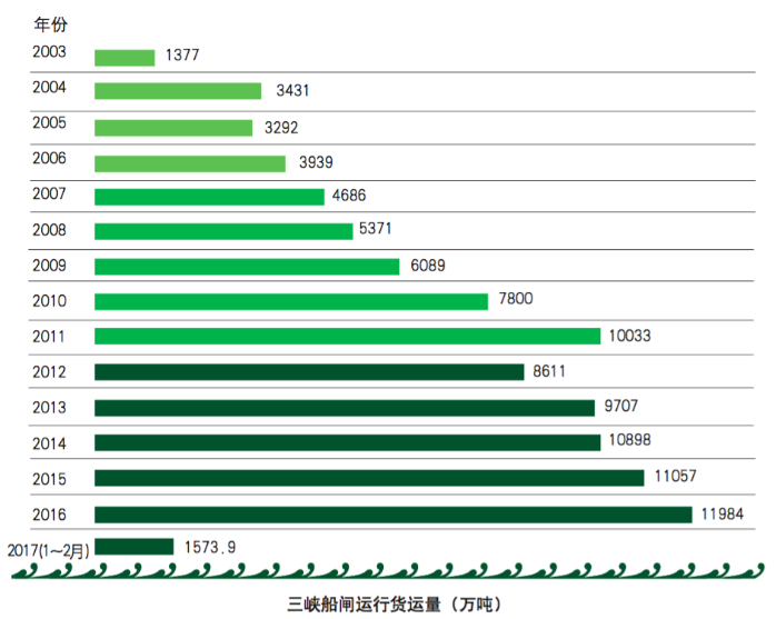 投入運(yùn)行以來(lái),三峽船閘過(guò)閘貨運(yùn)量逐年遞增,2011年首次突破億噸,提前19年達(dá)到設(shè)計(jì)能力。2014年至2016年連續(xù)3年貨運(yùn)量突破億噸。截至2017年3月7日,三峽船閘累計(jì)運(yùn)行12.87萬(wàn)閘次,過(guò)船73.1萬(wàn)艘次,通過(guò)旅客1181.5萬(wàn)人次,貨運(yùn)量10.01億噸。