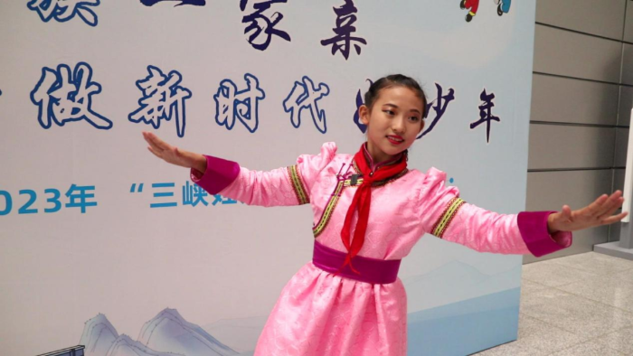 “我愛(ài)56個(gè)民族組成的大家庭,更愛(ài)我們偉大的祖國(guó)?!眮?lái)自內(nèi)蒙古巴林左旗的阿諾金在感受壯美三峽的同時(shí),也用一段極具蒙古族特色的舞蹈向大家介紹了自己的家鄉(xiāng)。