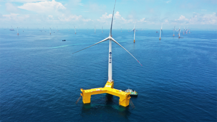 ▲我國首個漂浮式海上風電平臺,搭載全球首臺抗臺風型漂浮式海上風電機組,組成“三峽引領號”,在廣東陽江海上風電場成功并網發電(三峽能源供圖)